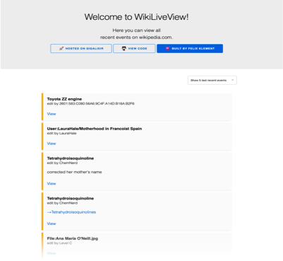 Wikipedia LiveView, a little demo to test out some phoenix_live_view features using the SSE provided from the wikimedia Kafka clusters. | Wikipedia LiveView Source |